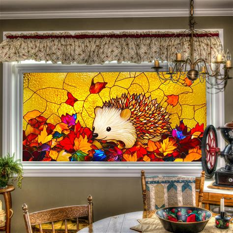 HOMETITUTE Autumn Window Cling Hedgehog Window Sticker Static Windows Cling Fall Windows Privacy Film Horizontal Glass Decal 39.37X17.72 Inch For Home