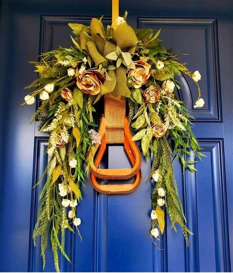 Deluxe Crescent Swag Stirrup Wreath - Rustic Wood Rose Stirrup Wreath With Green Burlap Ribbon