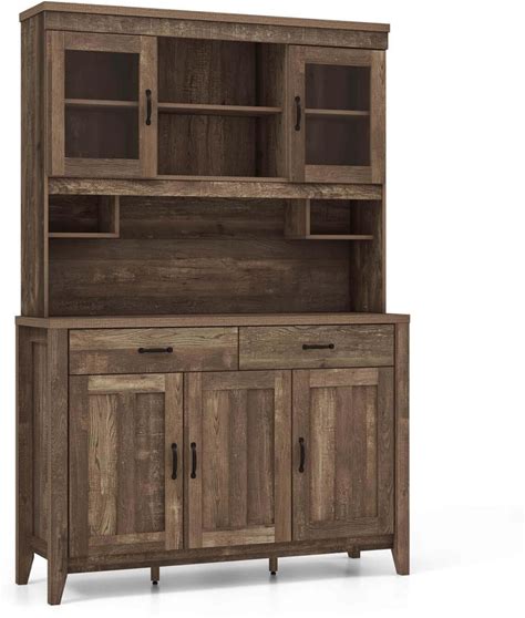 Costway Kitchen Pantry Cabinet With Microwave Countertop Double Glass Doors 2 Drawers - Brown